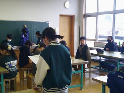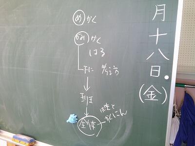 学習の道筋を自分たちで決め、それを黒板にメモしています。 |