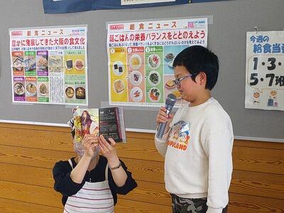 本校では読書活動を大切にしています。 図書委員の子どもが、給食の終わり時間におすすめの本を紹介しています。とても気に入った本を手に取ってほしいという願いから、クイズを出して全校生に紹介しました。「ぼく、やってみたい」が、学校全体への働きかけになり、一歩前進しました。 今後も、おすすめの本を紹介していきます。 |