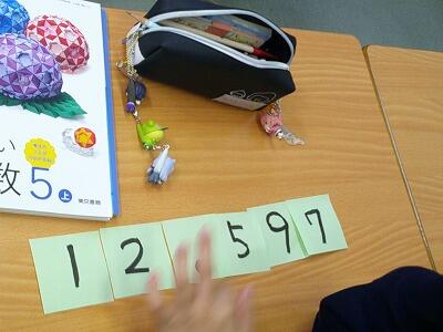 5年生算数の時間です。 始めに数を並べ替えて、一番大きな数を作ります。答えは、「97.521」 次は… 「一番小さい数をつくってみようかな」教師が発問する前に、次の活動を予測して作っていました。 その次は… 「2番目に小さいの…。」 |