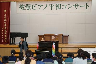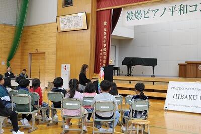 本校体育館で被爆ピアノ平和コンサートが行われました。保護者・地域の方も多数来てくださいました。被爆したピアノを使ってピアニストの近藤さんが、「アヴェマリア」「エリーゼのために」「トルコ行進曲」「戦場のメリークリスマス」等々の楽曲を演奏してくれました。平和の尊さを伝え続ける被爆ピアノの音色は、子ども達にどんな風に伝わったのでしょう。