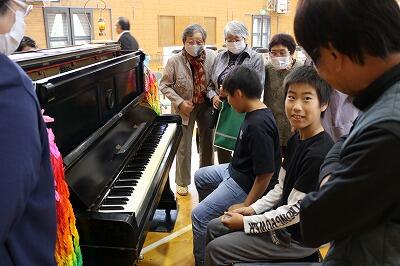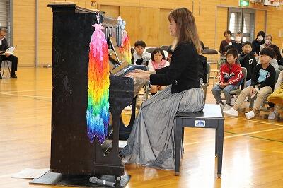 体育館中に響き渡るきれいな音色に、会場にいる全員がそれぞれの思いに浸りながら聴き入っていました。最後に被爆ピアノを使って本校の牧野教諭が伴奏し、全員で校歌を歌いました。
