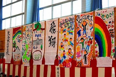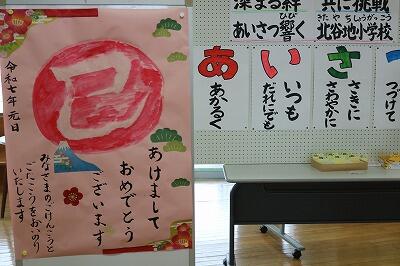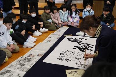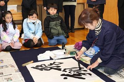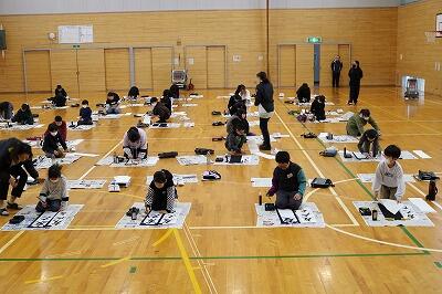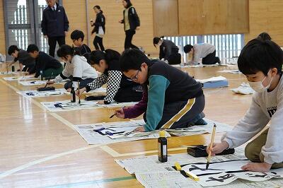体育館では、はじめに昨年の終わりから書き初めの指導をしてくださっている渡部先生から大きな紙に字を書いていただきの作品ができるまでを間近に見させていただきました。書の「飛翔」には、渡部先生の子ども達への思いが込められています。その後の先生のアドバイスを聞いて子ども達は書き初めに真剣に取り組んでいました。