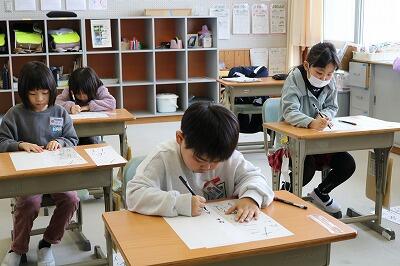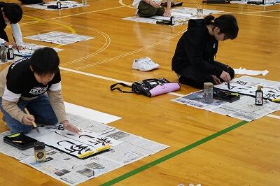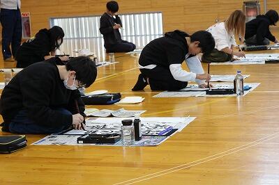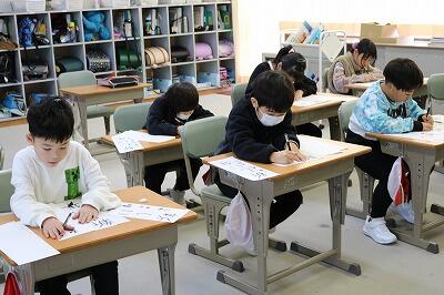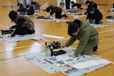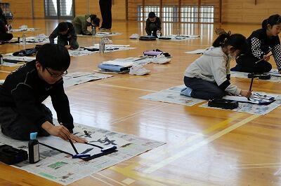 今日は校内書き初め大会を行い、1・2年生は教室で、3年生以上は体育館で書きました。