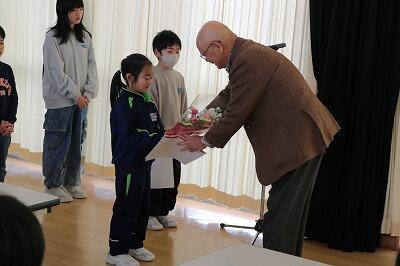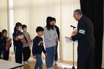 交通指導員・見守り隊の方々への感謝の会で、子ども達が安全に登下校できるように、毎日見守ってくださっている交通指導員と子ども見守り隊の方々に、日頃の感謝の気持ちを伝えました。代表の児童からは、全校生が書いた感謝のお手紙と花束をお渡ししました。