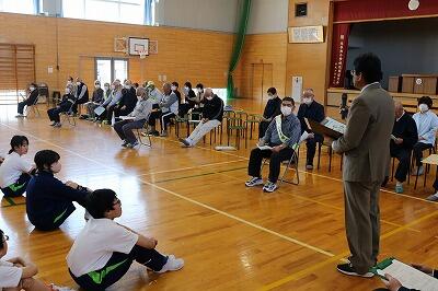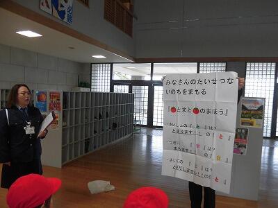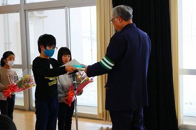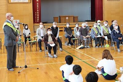 会長さんからは、「これからも毎日安全に気をつけて元気に学校に来てください。また,何か危険な目にあったときは声を出して近くのお家に助けを求めてください。」とお話がありました。
