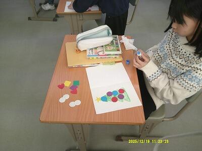 色や形を先生からもらって、その形を使ってクリスマスカードを作りました。
